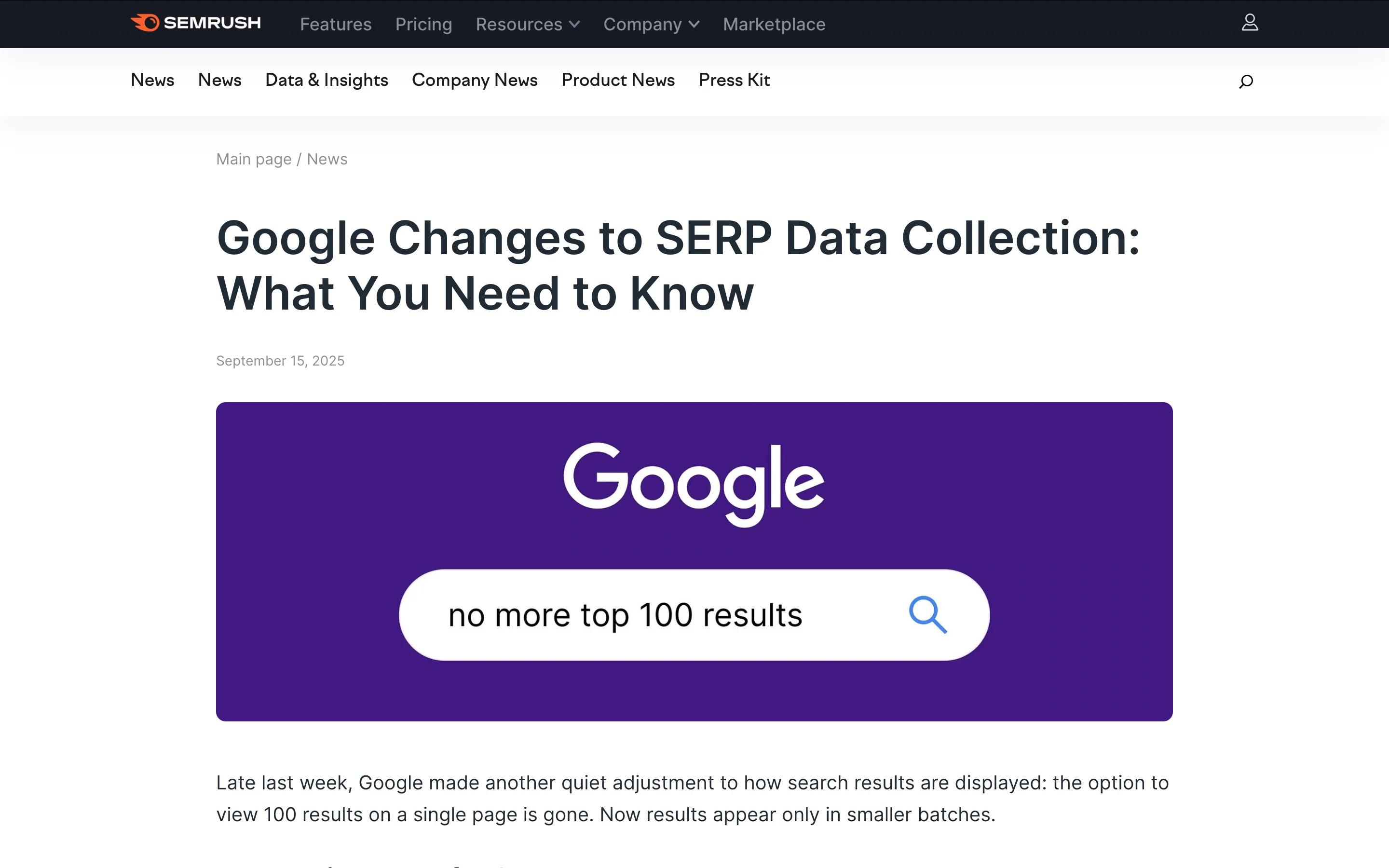 อันนี้เป็น Semrush ออกมายืนยันเองครับ (อ่านเพิ่มเติม Google Changes to SERP data Collection) ทาง Semrush ขึ้นกราฟิก พร้อมข้อความคำโต ๆ บอกว่า "no more top 100 results" คือไม่มีอีกแล้ว 100 อันดับ ที่ตรูเคย query (ดึงข้อมูล) มาได้ใน 1 request