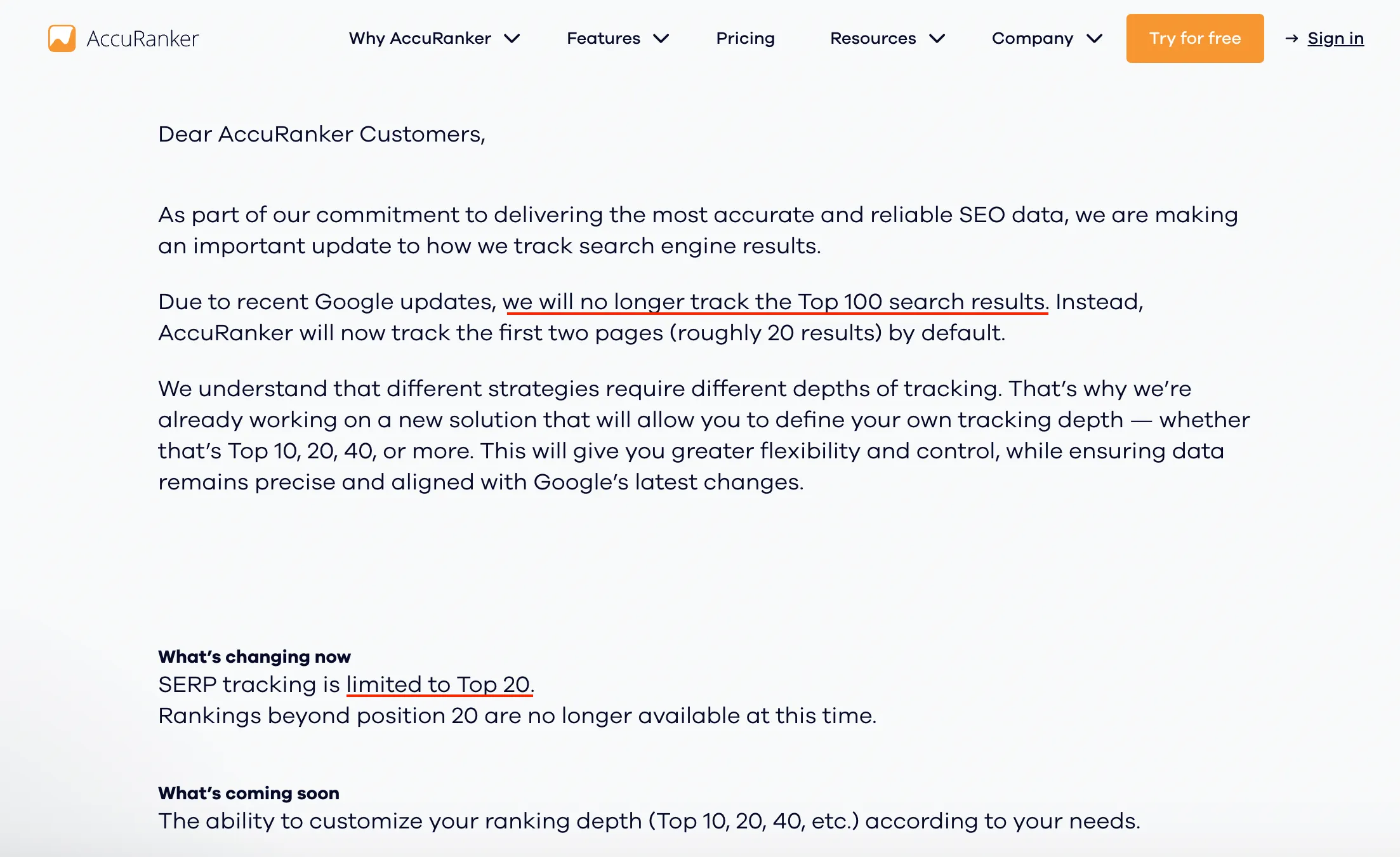 ส่วน AccuRanker ซึ่งเป็นหนึ่งในเครื่องมือสำหรับ track keywords ที่มีชื่อเสียงอีกตัว ก็ได้รับผลกระทบส่วนนี้เต็ม ๆ และตอนนี้มีการจำกัด (limit) การ track คีย์เวิร์ดแต่ละตัวไว้ได้สูงสุดที่อันดับ 20 จากปกติได้ถึงอันดับ 100