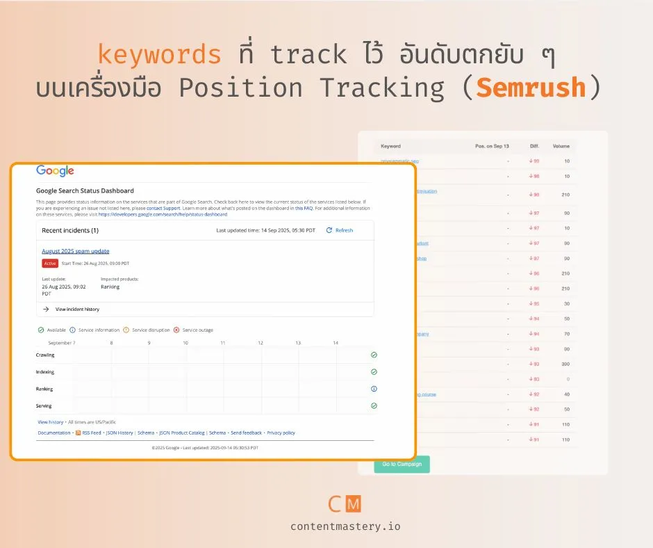 และแน่นอนครับว่า อันนี้ก็เจอกับตัวเลยครับ เครื่องมืออย่าง Position Tracking ของ Semrush ก็รวนหนักครับ (จึงเป็นที่มาของโพสต์นี้ด้วย บน Facebook post ของเพจครับ) ที่ keywords ทุกอันที่ผม track ดิ่งลงยับ เลยเกิดคำว่า... "เอ๊ะ" ในใจตั้งแต่วันนั้น